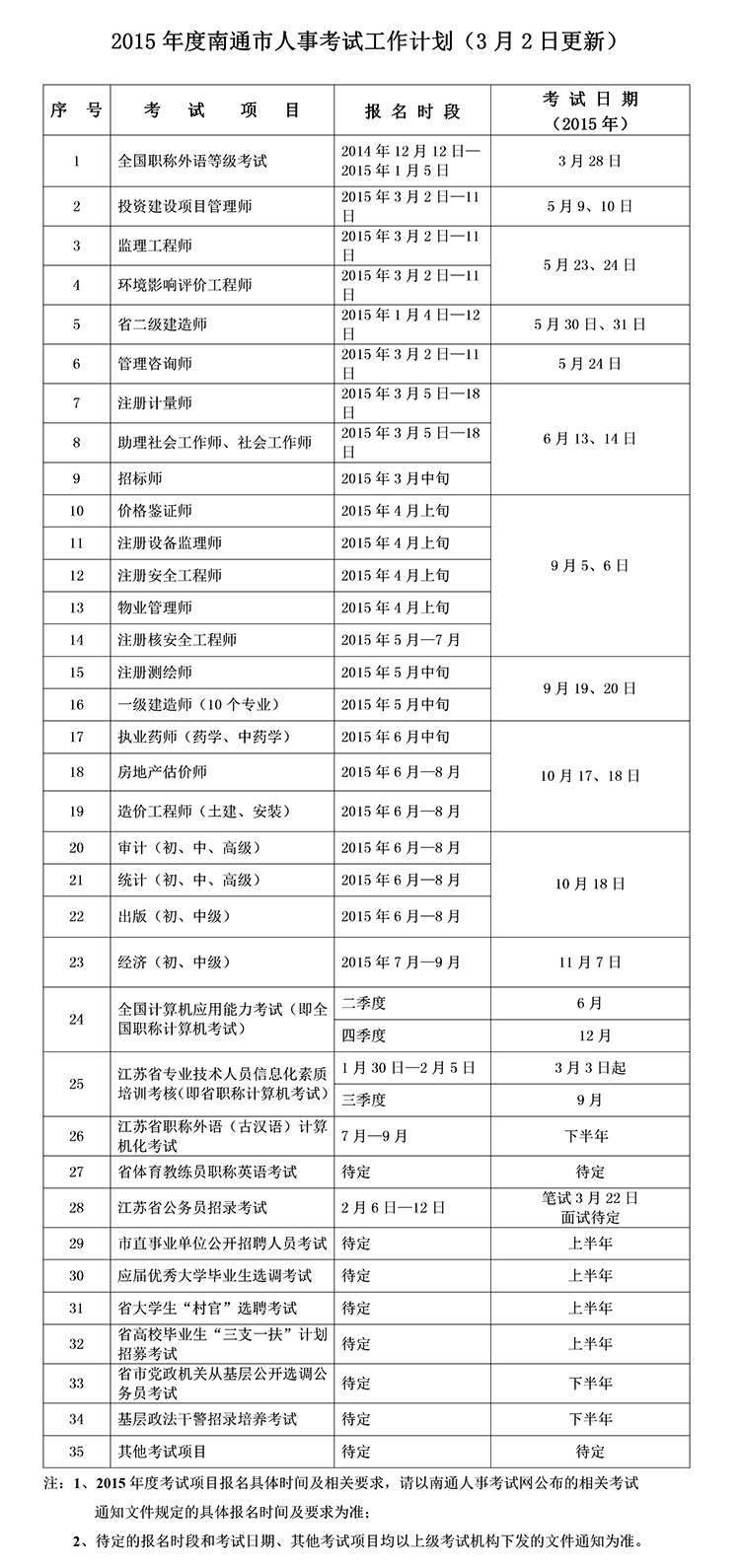 2015年度南通市人事考試工作計劃